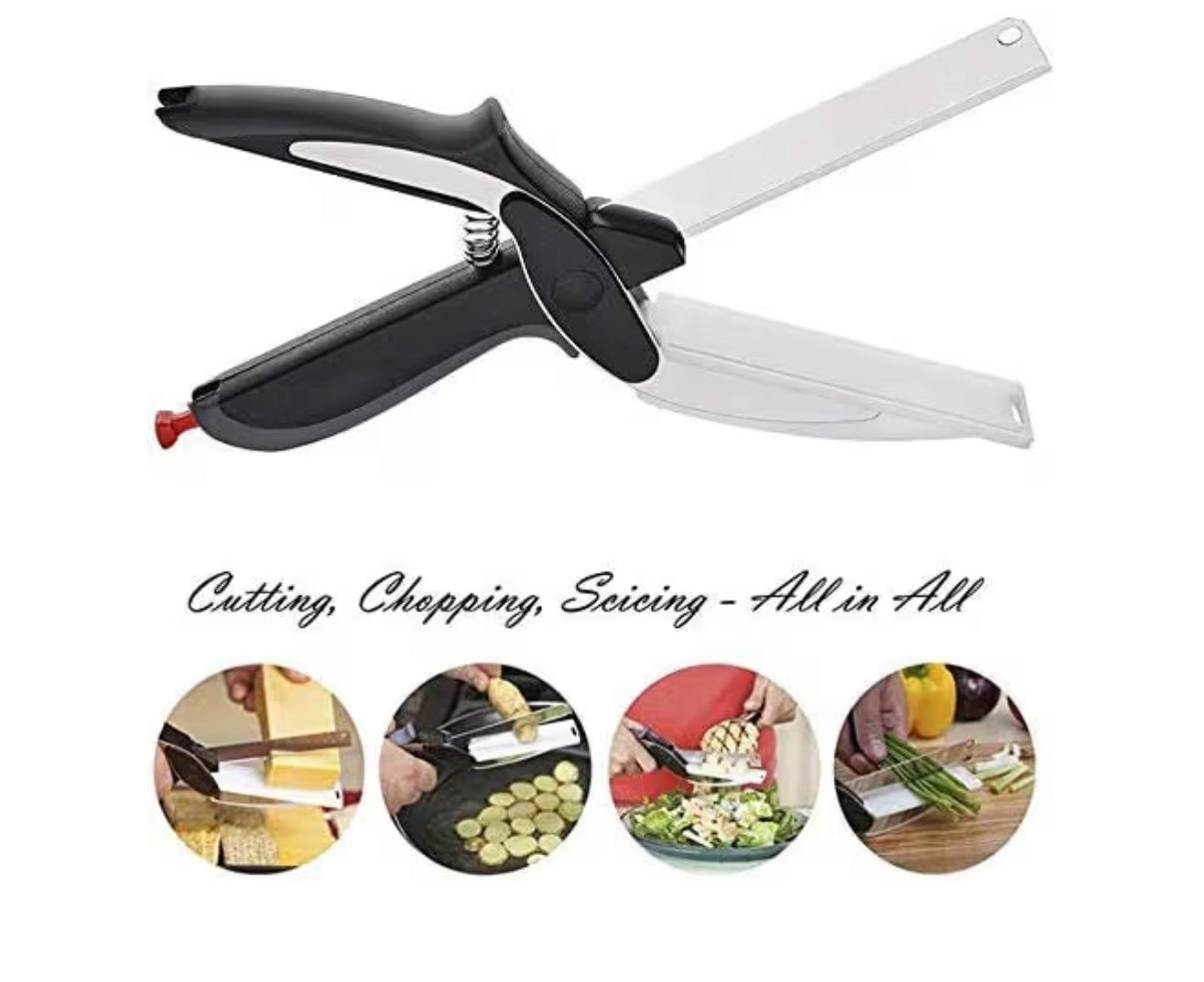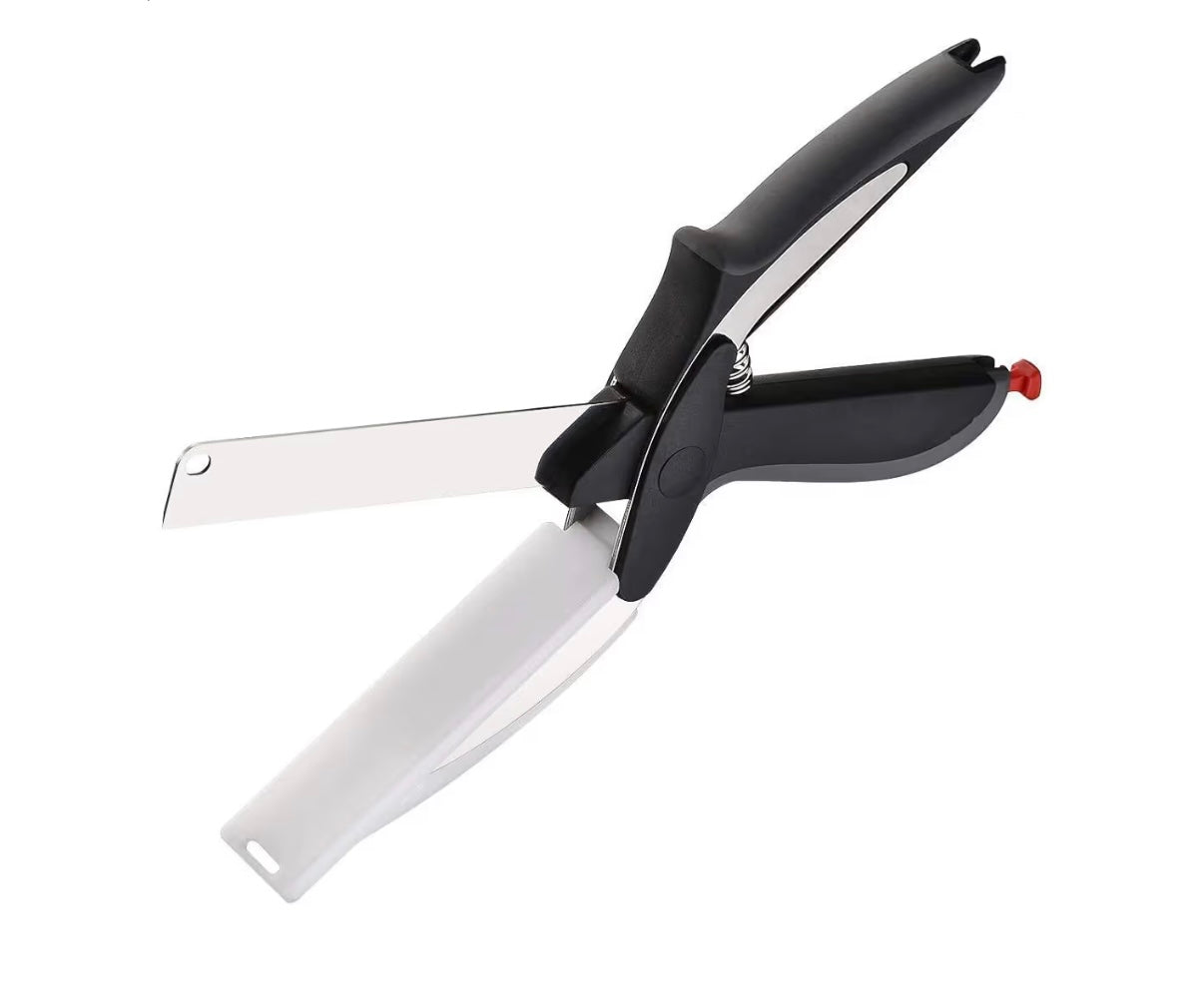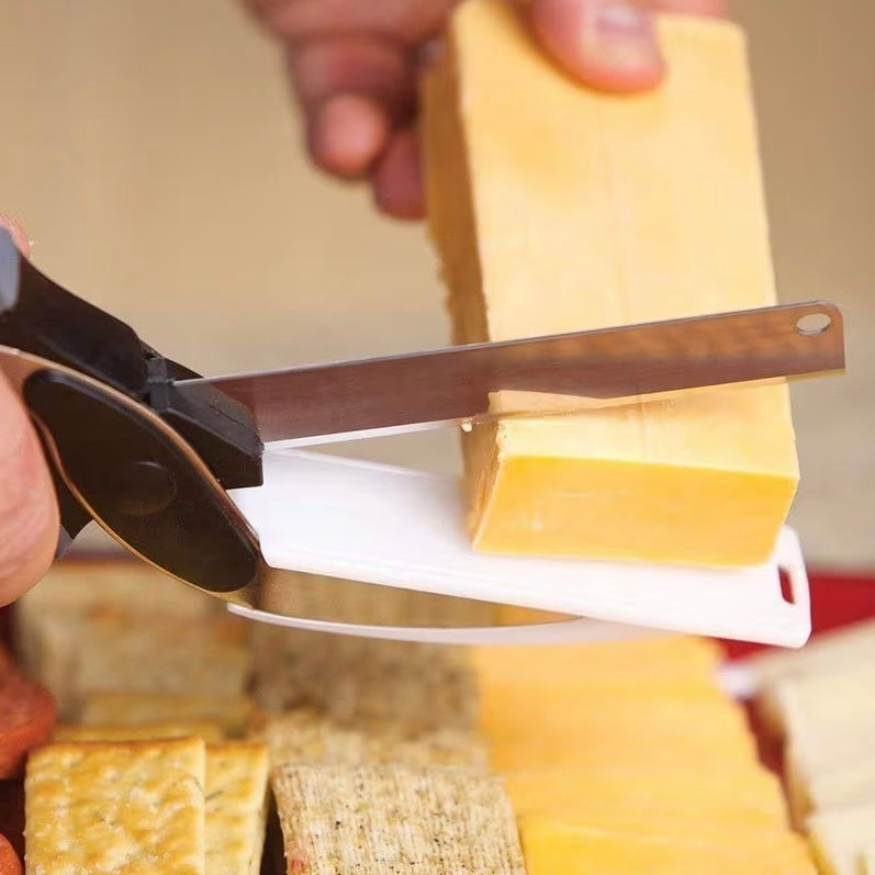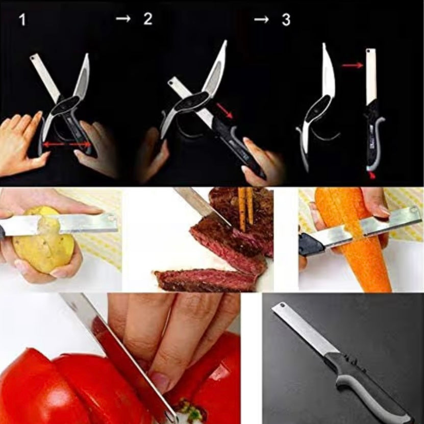 Cut with ease with the kitchen knife-scissors! An original kitchen utensil with an innovative design that integrates knife and board...